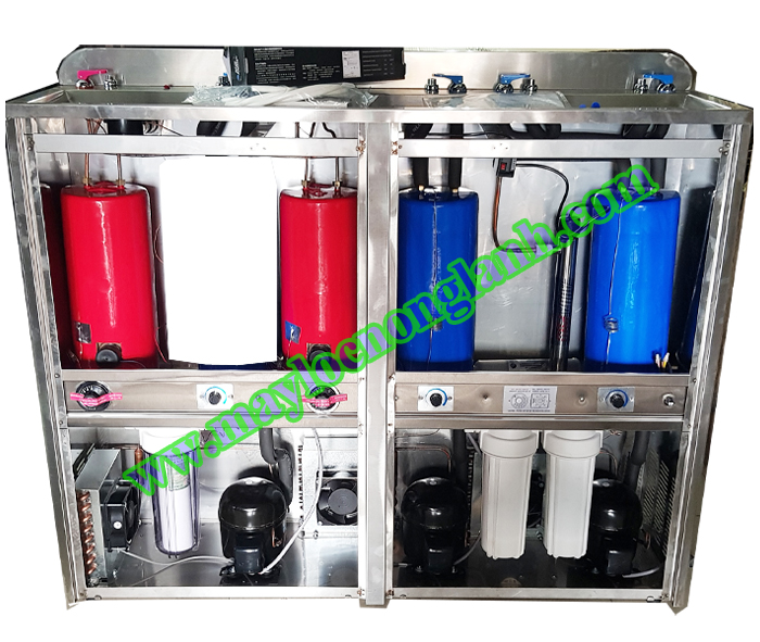 • Hệ thống làm lạnh gồm 2 block, 2 dàn nóng, 2 quạt tản nhiệt với công suất 165W, 2 bình chứa nước lạnh chất liệu inox 304 với dung tích 4,5 lít, công suất cung cấp nước 45-50 lít/giờ